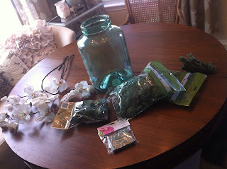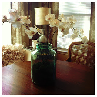 The glass hurricane sells for $79, but I wanted to come in way under that. I already had the orchid stems. I need a few bags of moss sheets, balls, and floral putty to hold it down. I knew I also wanted a tinted glass hurricane. I found one at Target for $23.