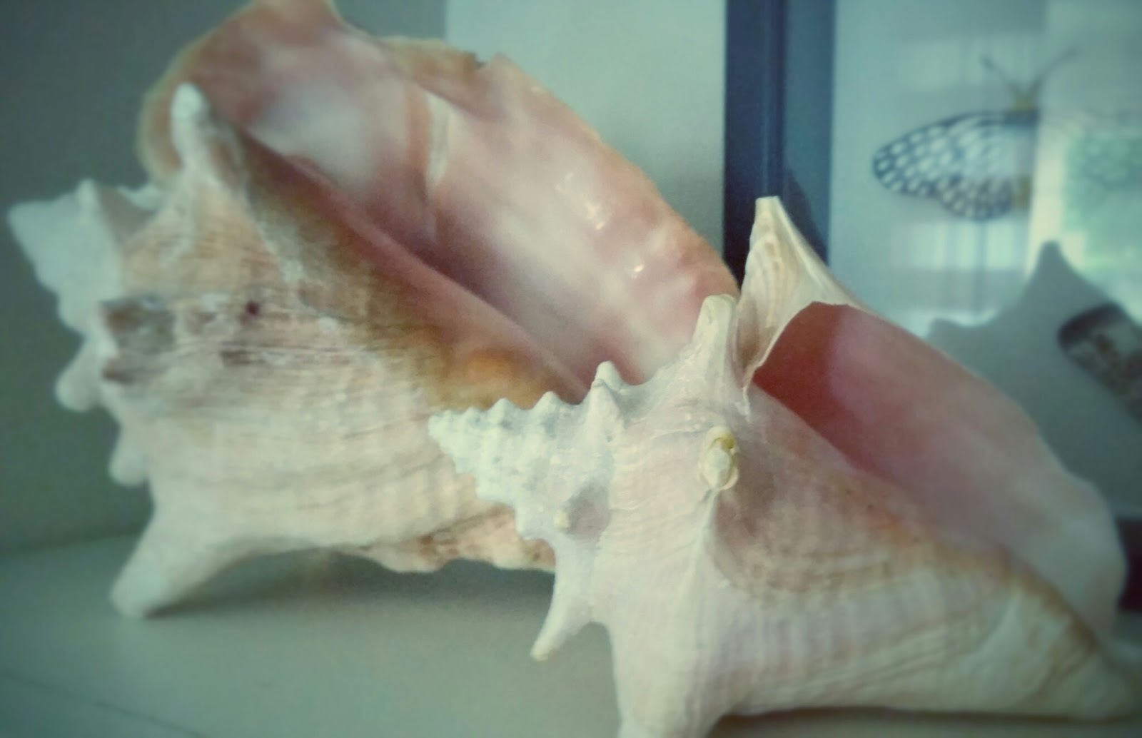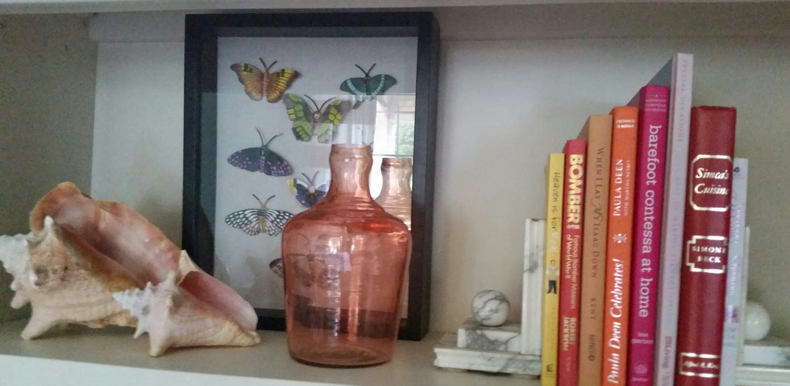 In this photo, I wanted to highlight the colors of the conch shells — corals, pinks, oranges (the missing book..Mr. Bee is reading cover-to-cover Mastering Art of French Cooking). Use artwork on your shelves too, propped up as a backdrop. I made the shadow box of butterflies which are actually push pins.