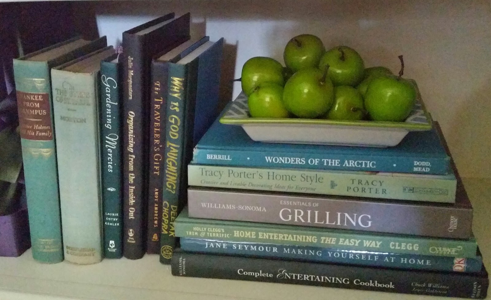 A simple trick is to style by color scheme. You will see on the bottom shelf in the photo below I put mostly blue and green books together, with a dish of small, green apples and a large green glass vase. By taking off the covers to your books, you can find some beautiful color schemes to work with. Put the covers away in a safe place if you want to put them back on your books later. To balance the bottom self, I repeated the green a few shelves above it, then again with the light green photo album propped up on the second shelf.