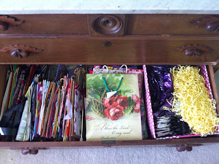 One thing I did to help organize the gift bags was to take adjustable tension rods and place them in the bottom drawer so I could “file” the bags to keep them side by side. This helps me to see what I have.